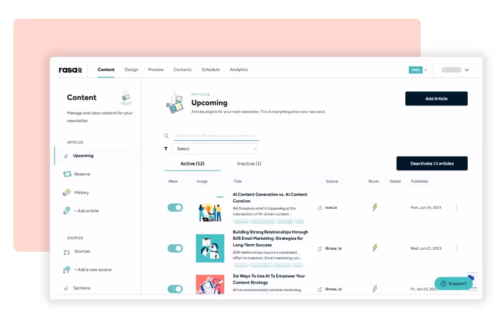 Features: Rasa.io uses AI to analyze user preferences and behavior, curating relevant articles and content for each subscriber. The platform optimizes engagement by sending personalized newsletters, minimizing manual work while maximizing open rates.