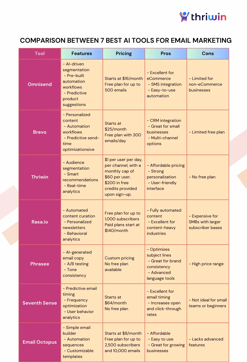 Regarding email marketing, Thriwin stands out by seamlessly blending cutting-edge AI technology with user-friendly design. Unlike other tools, Thriwin intuitively analyzes customer behavior, enabling you to craft personalized campaigns that resonate with your audience. Its powerful automation features save you time while enhancing engagement rates, ensuring your messages don’t just get sent—they get noticed. Ready to transform your email marketing strategy? Visit thriwin.io today to book a demo and see the difference for yourself!