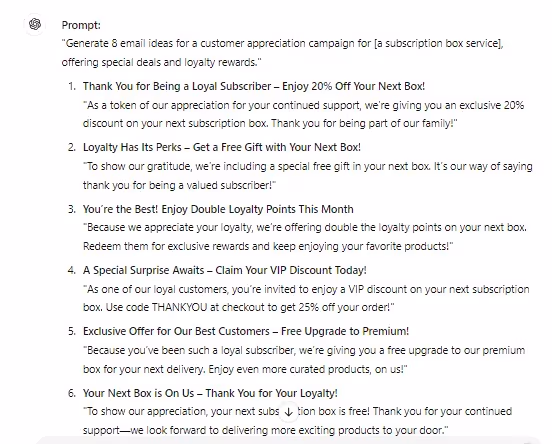 "Generate 8 email ideas for a customer appreciation campaign for [a subscription box service], offering special deals and loyalty rewards."