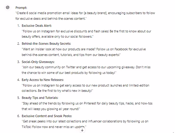 "Create 6 social media promotion email ideas for [a beauty brand], encouraging subscribers to follow for exclusive deals and behind-the-scenes content."