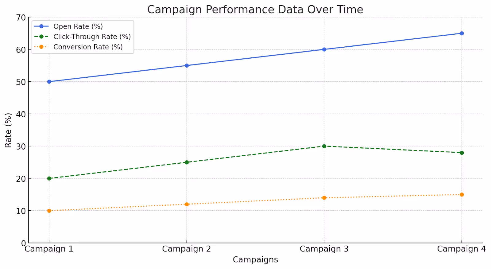 - Open Rate: Gradually increases with each campaign, moving from 50% in Campaign 1 to 65% in Campaign 4. This trend may indicate that refining timing and messaging strategies effectively boost initial engagement.