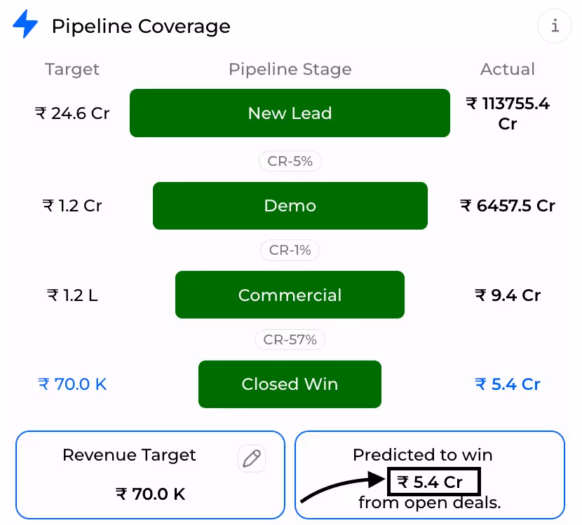 As actual new lead is more than target value of predicted so we achieved new lead so it is green.same in demo stage case as well. But in commercial we need 12.3 cr as per history actual amount is 9.4 cr so here it is red as it is not achieved.