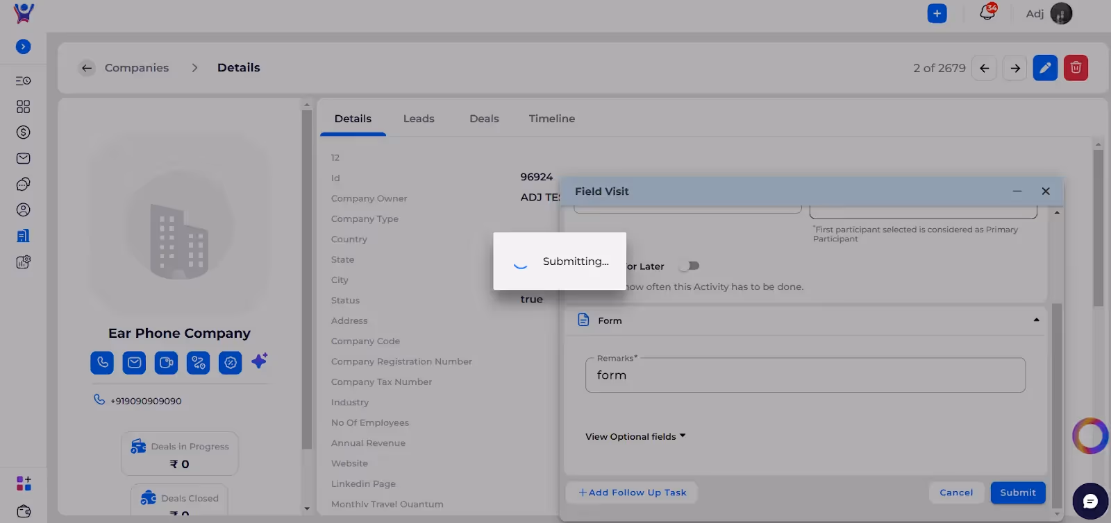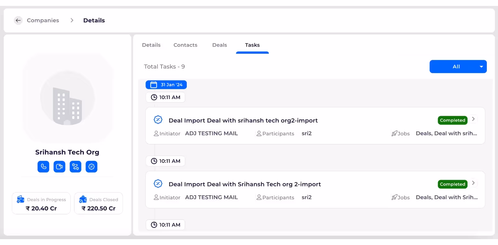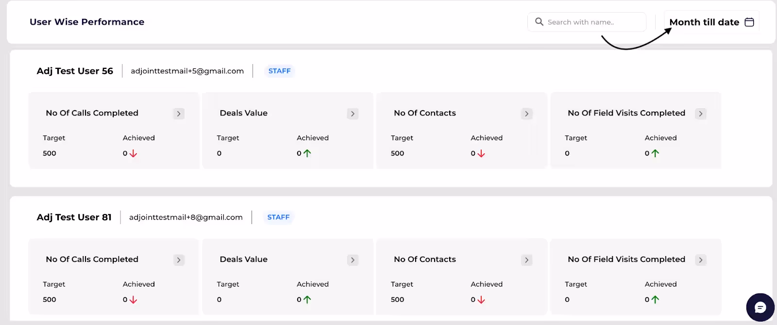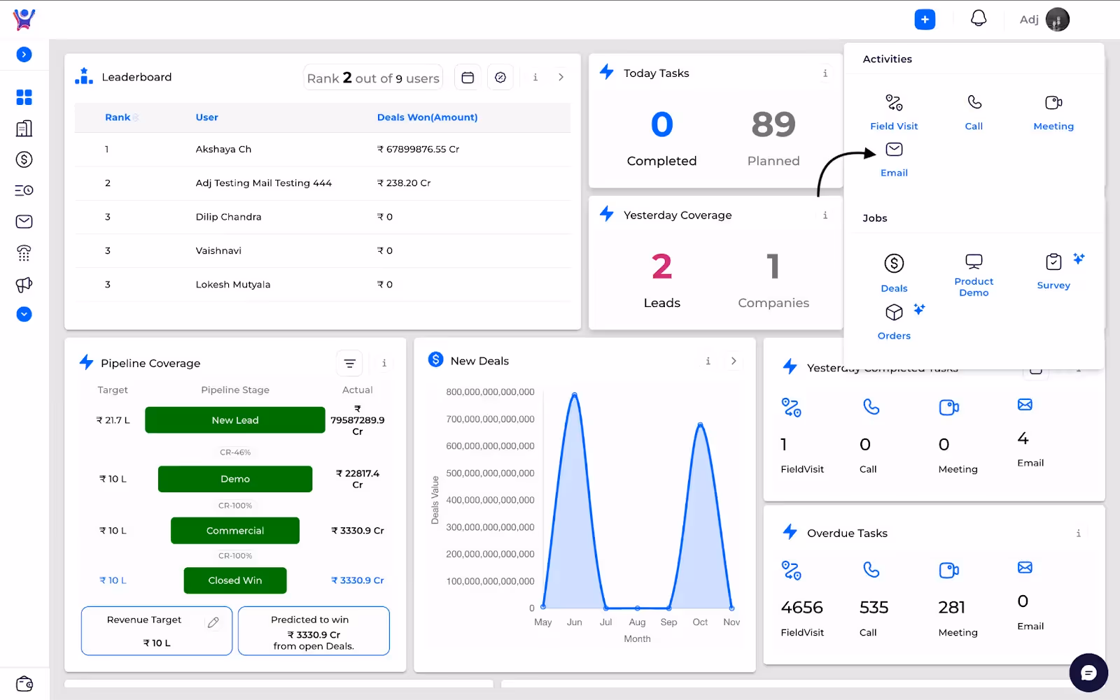 - Which shows the progress or the current status of all the activities taking place like, field visits, calls , meetings , deals , company and contact generation and few of the summarized analysis on deals.