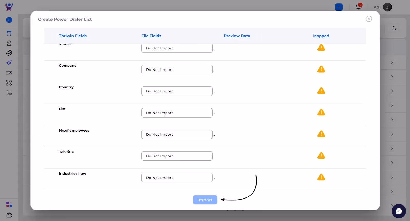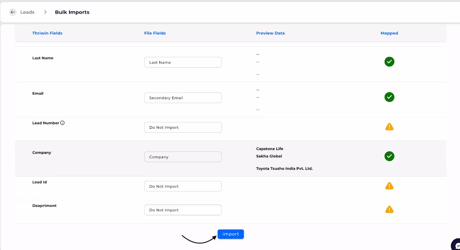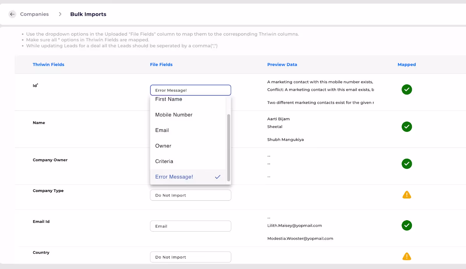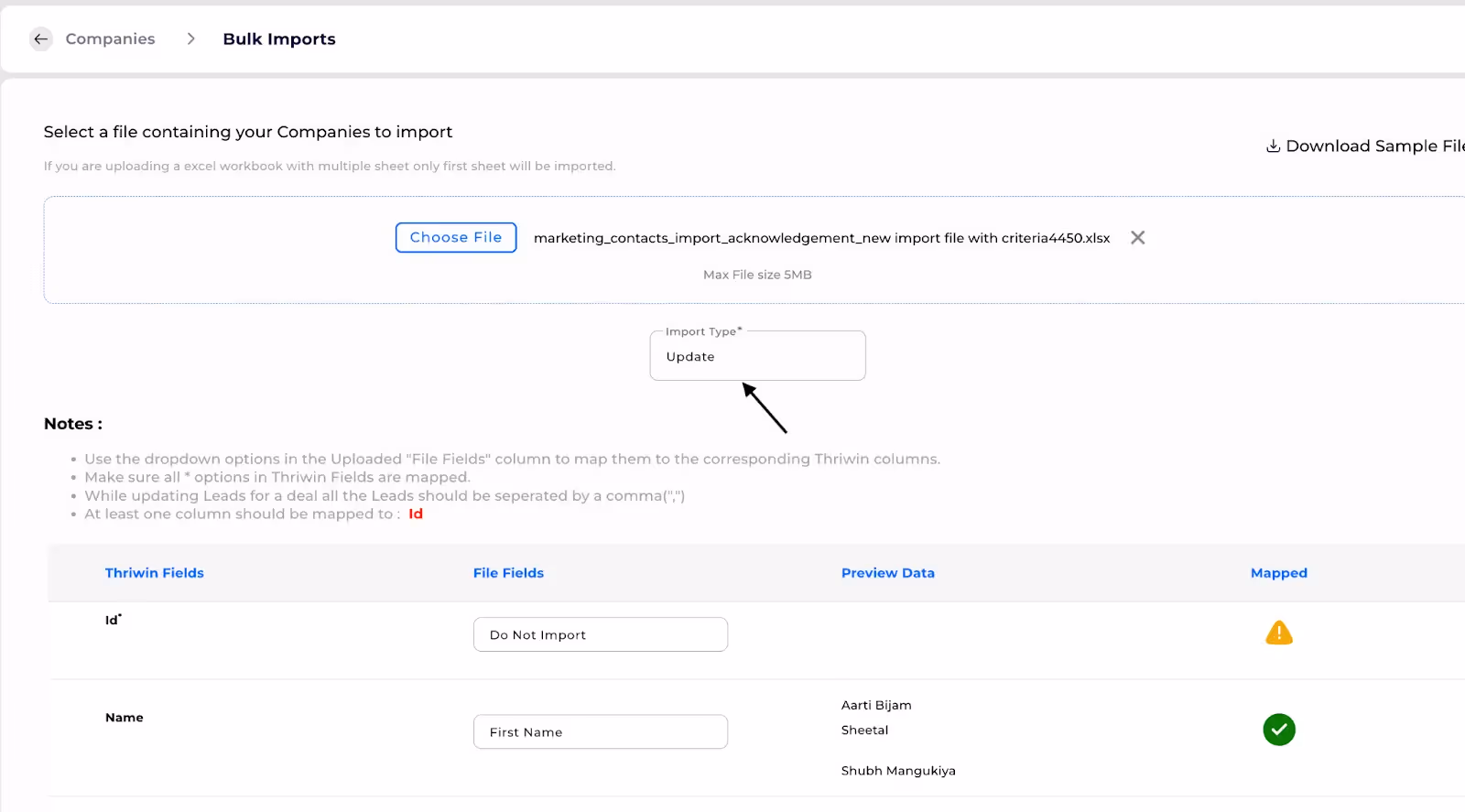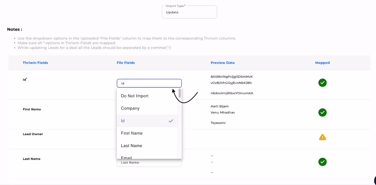 Step 4:Map the file columns to the corresponding system fields. The "ID" field is mandatory for updating a contact, as the data will be updated based on this ID.