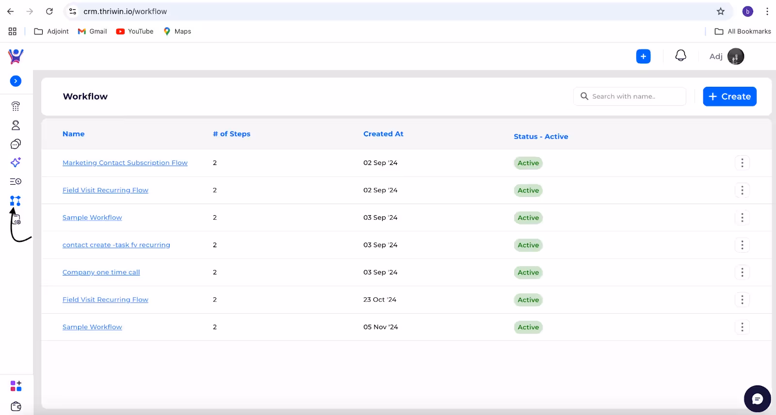 - Locate the + Create button on the top-right corner of the Workflow page.